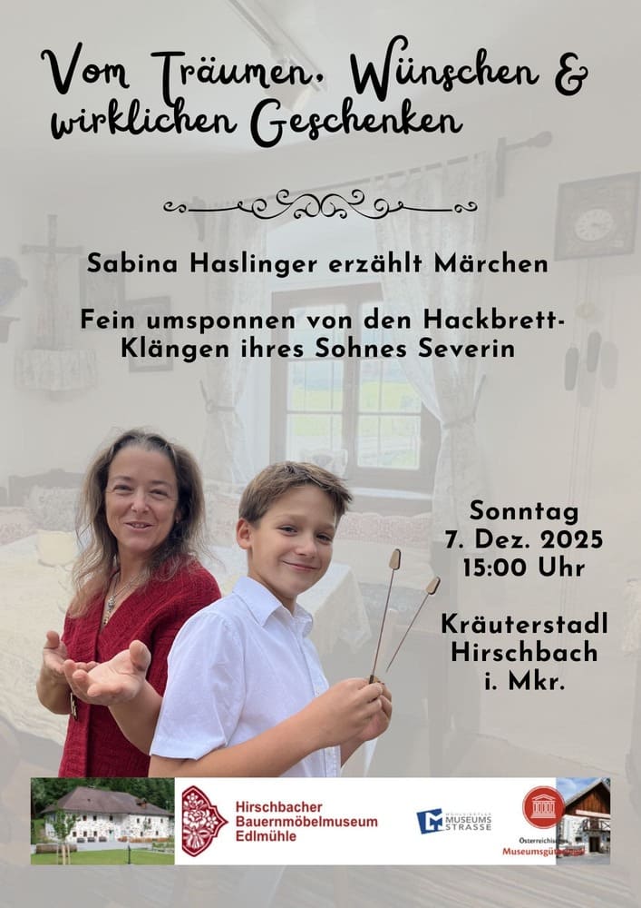 Gemeinsam mit meinem Sohn Severin, der mich am Hackbrett begleite erzähle ich an diesem Nachmittag im Kräuterstadl in Hirschbach Märchen für Jung und Alt. Seid gespannt welche Wünsche in Erfüllung gehen, und welche nicht! 😉